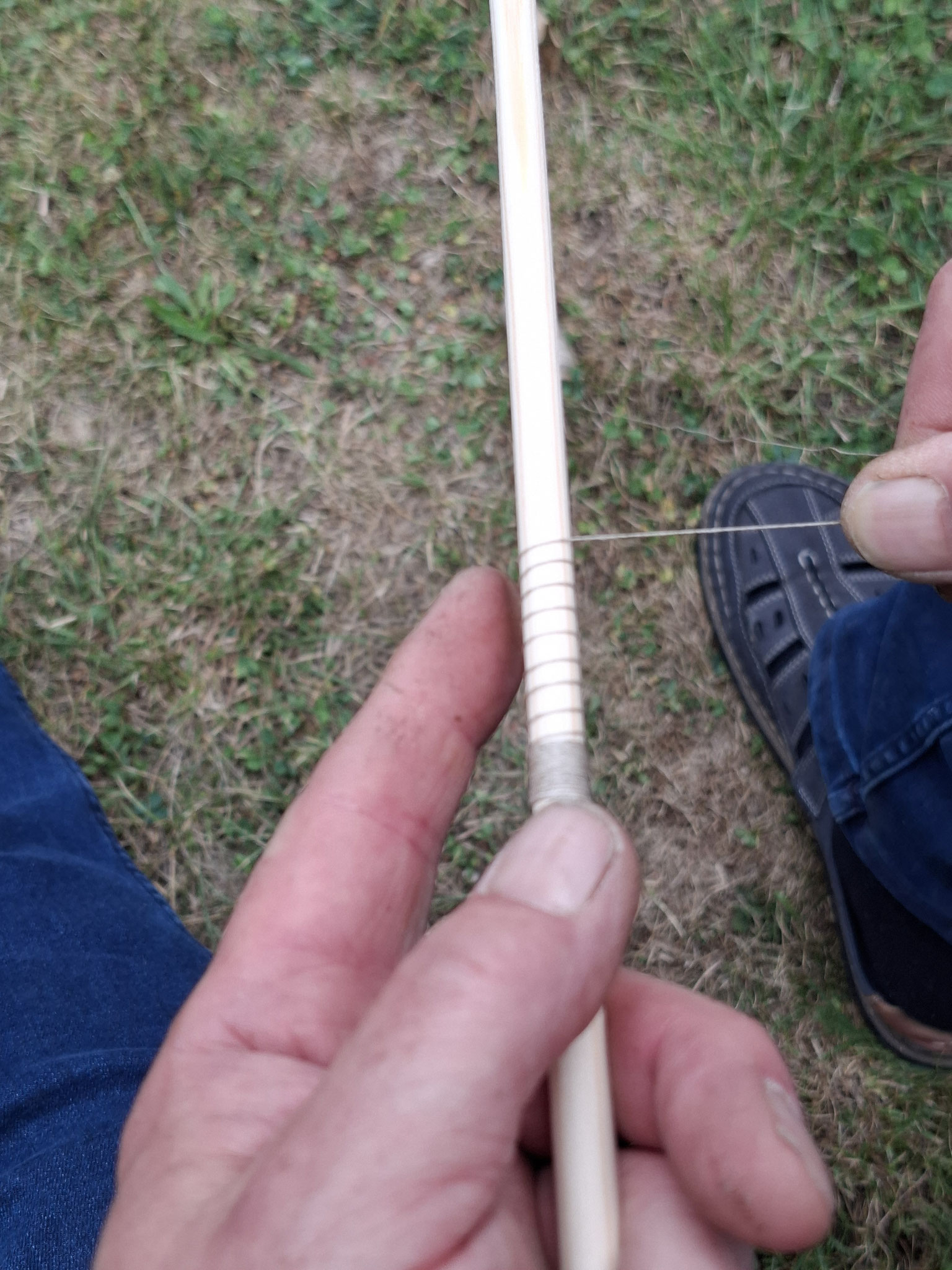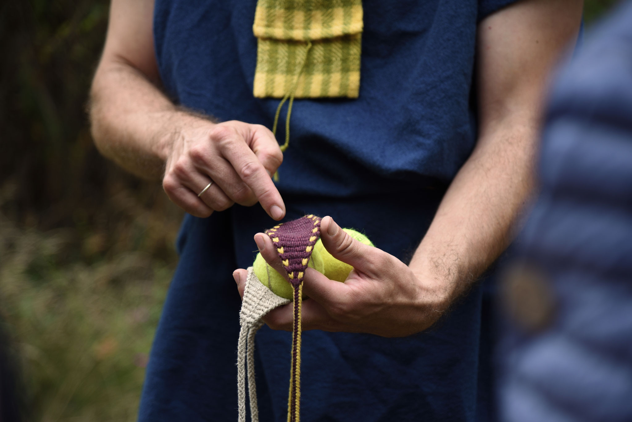 Die Gruppe erhielt zunächst spannende Einblicke in das historische Handwerk. Schon bald aber stand das eigene Tun im Vordergrund: in Trockenübungen wurde das Wickeln der Befierung geübt, bevor die Technik am ersten Pfeil ausprobiert wurde. Das Befiedern der Schäfte erforderte höchste Präzision.