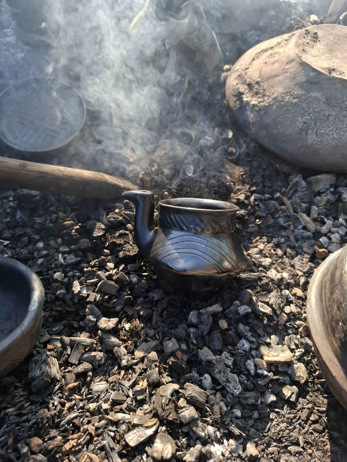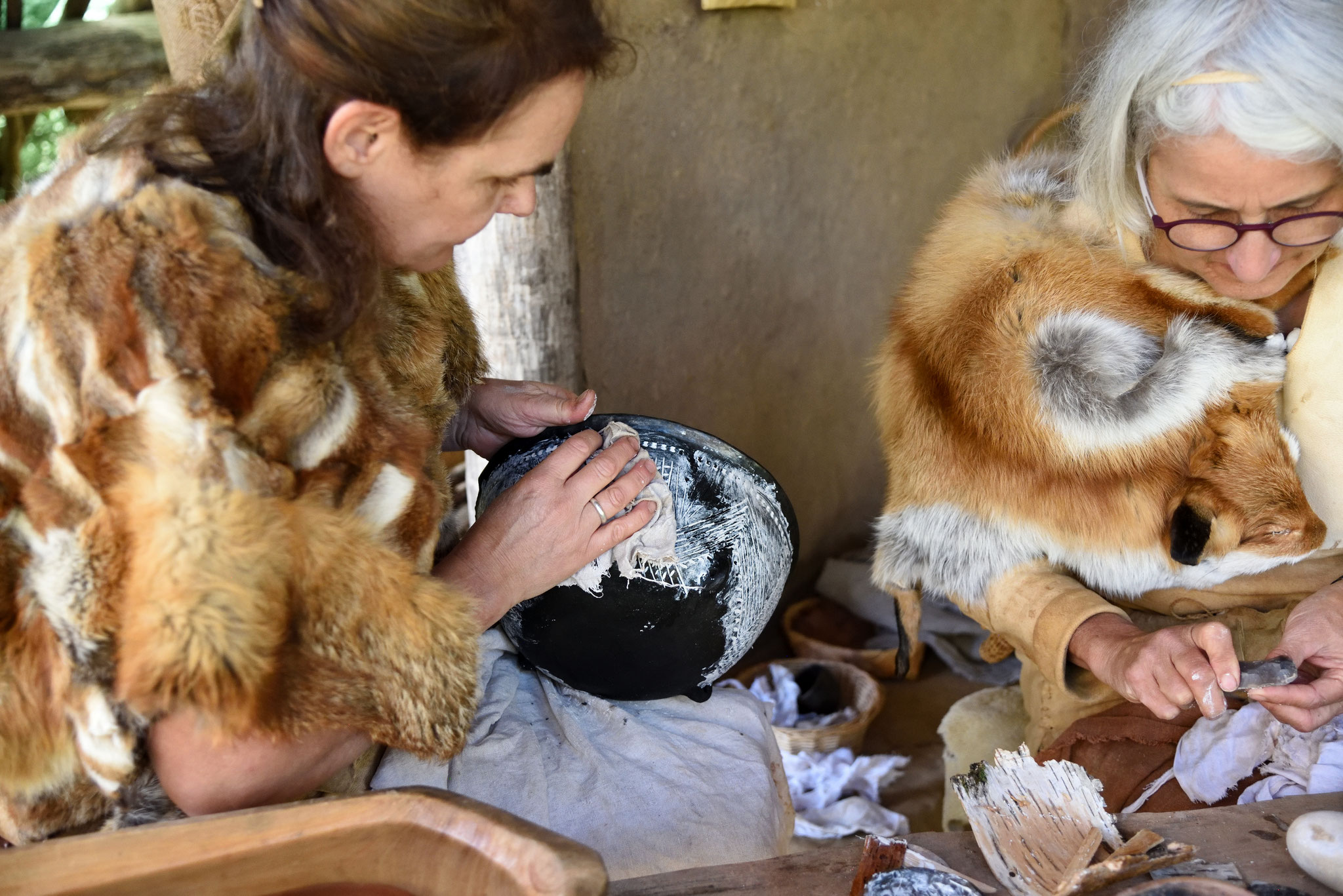 Bei einem Grubenbrand wird Keramik in einer Erdgrube gebrannt, wobei das Feuer gezielt sauerstoffreduzierend geführt wird. Holz, Blätter und organische Materialien bedecken die noch heißen Gefäße, sodass während der Abkühlphase der Sauerstoff entzogen wird. Das Ergebnis: charakteristische schwarze Keramik, wie sie schon in der Jungsteinzeit hergestellt wurde.