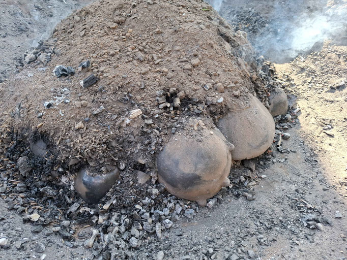 Auf der Zeiteninsel wurde es am letzten Wochenende wieder heiß - und das im wahrsten Sinne des Wortes: unter der Leitung von Su Gütter führte die AG Keramik einen Grubenbrand durch. In vergangenen Kursen war viel Keramik der Vorgeschichte hergestellt worden und diese sollte nun reduzierend Schwarz gebrannt werden.